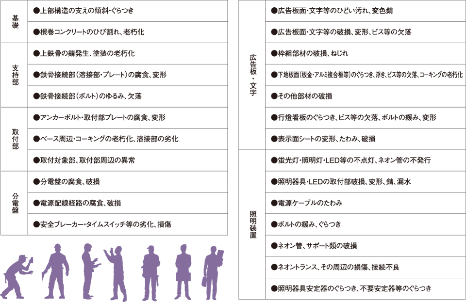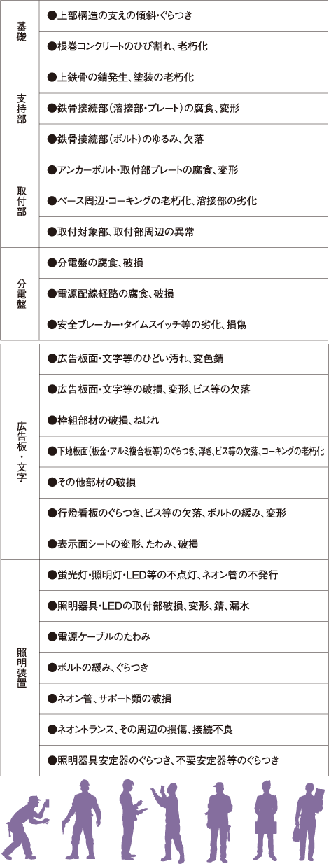 看板・サインの定期的な安全点検&メンテナンスは、おまかせください! 看板・サインの定期的な安全点検&メンテナンスは、おまかせください!